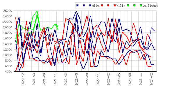 Der er 3 kurver for villaer og lejligheder, den nedre kvartil, medianen og den øvre kvartil.